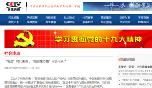 11月26日,中央電視臺(tái)民生資訊數(shù)字頻道唯一官網(wǎng)——CCTV民生網(wǎng)刊發(fā)題為《“智造”時(shí)代來(lái)襲,“創(chuàng)客生態(tài)圈”何去何從?》...
