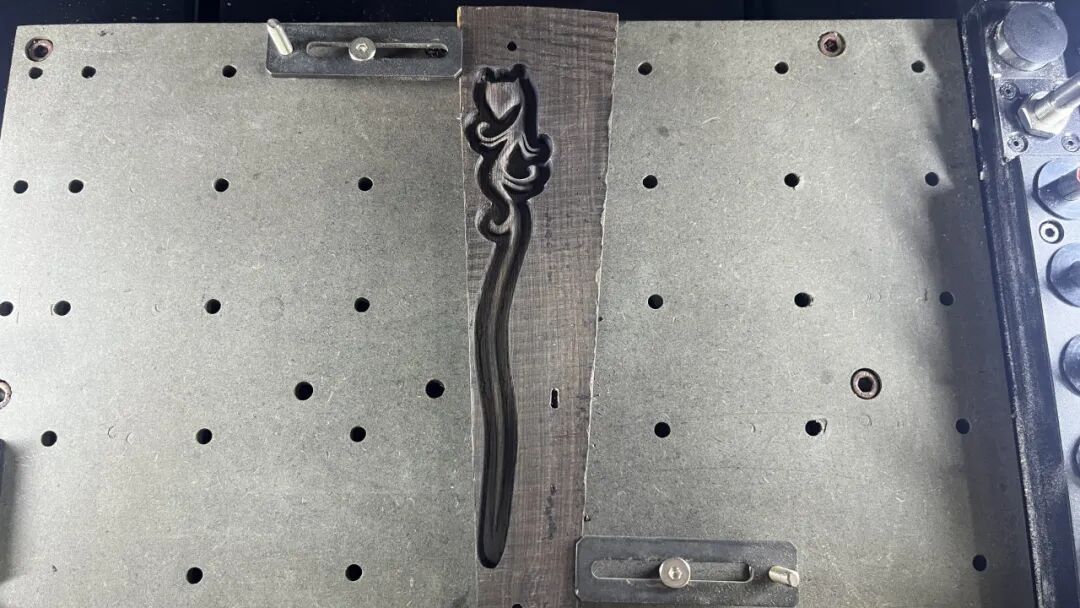 將加工完成的木質發(fā)簪正面置入銷釘,再將耗材翻轉180°對準上一步加工的銷釘孔置入。選擇“木質發(fā)簪反面”加工文件進行加工。