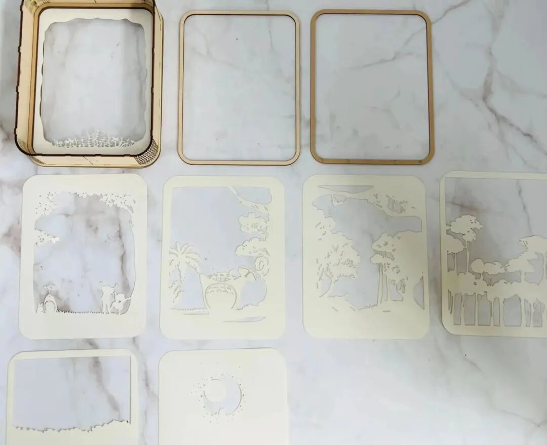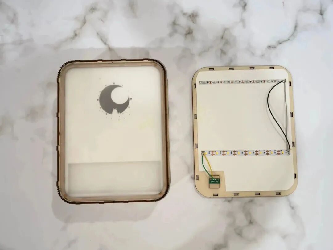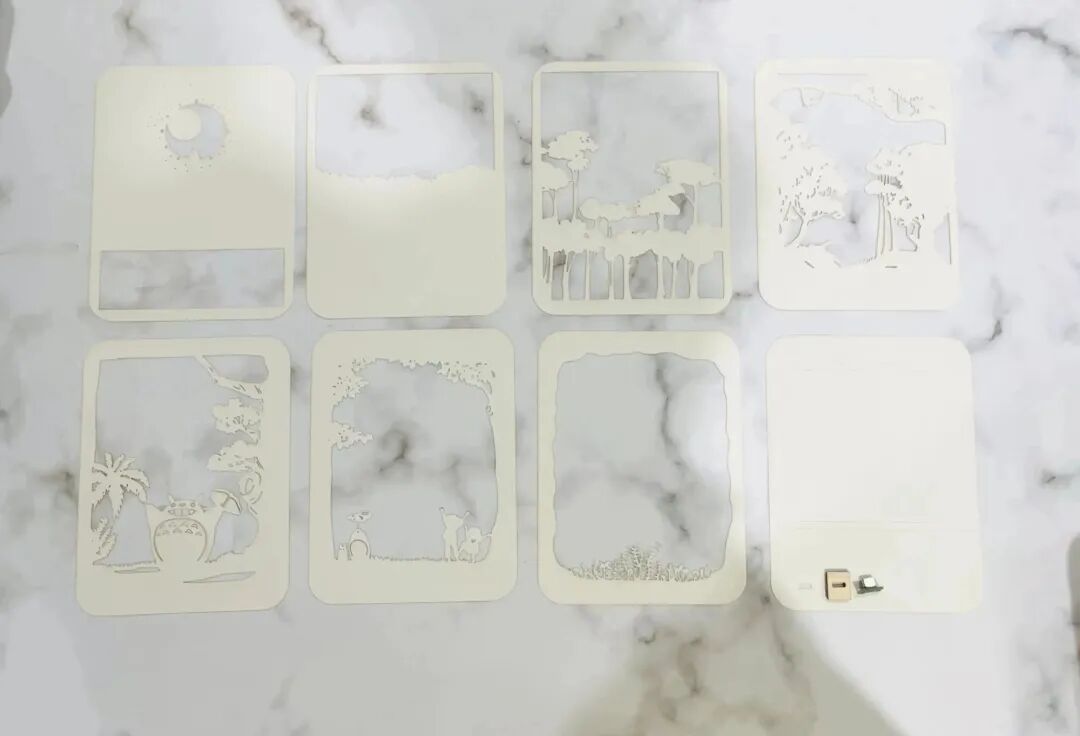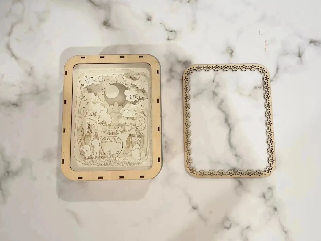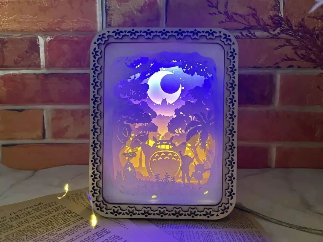 紙雕燈外框架為椴木板切割而成,正面防塵罩為透明PETG,內(nèi)部為A5紙張切割而成,并采用冷色燈帶與暖色燈帶進行照明,浪漫的龍貓紙雕燈就完成啦!