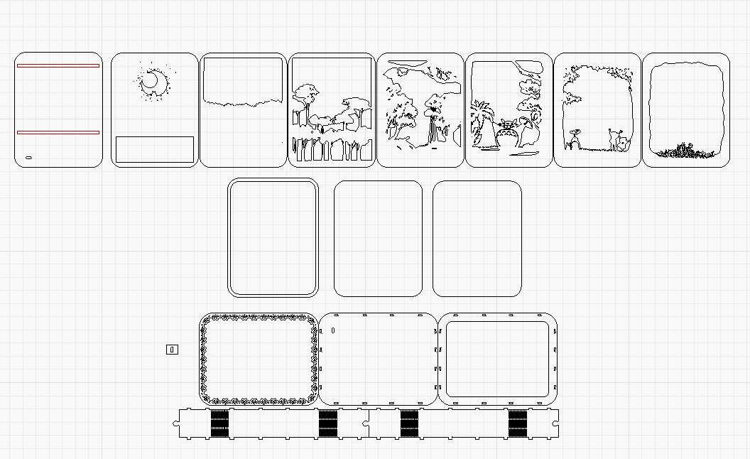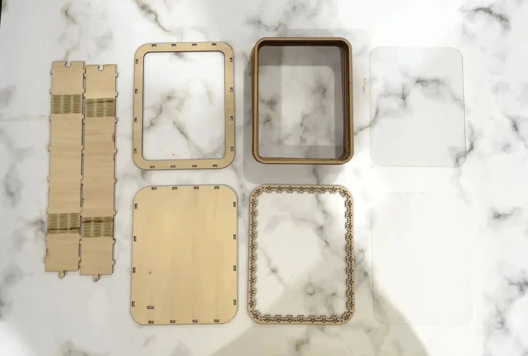 外框組裝好之后,將PETG置于第一層,依次往里放兩個支架之后再放一張切割好的圖紙,圖紙按順序放入,放完最后一層圖紙,記得放入硫酸紙哦~
