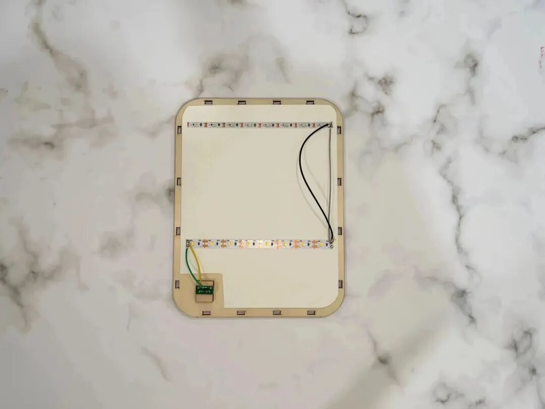 取出加工好的部件,將準備好的燈帶,焊接在圖紙確定好的區(qū)域,注意焊接上為冷色燈帶,下為暖色燈帶。